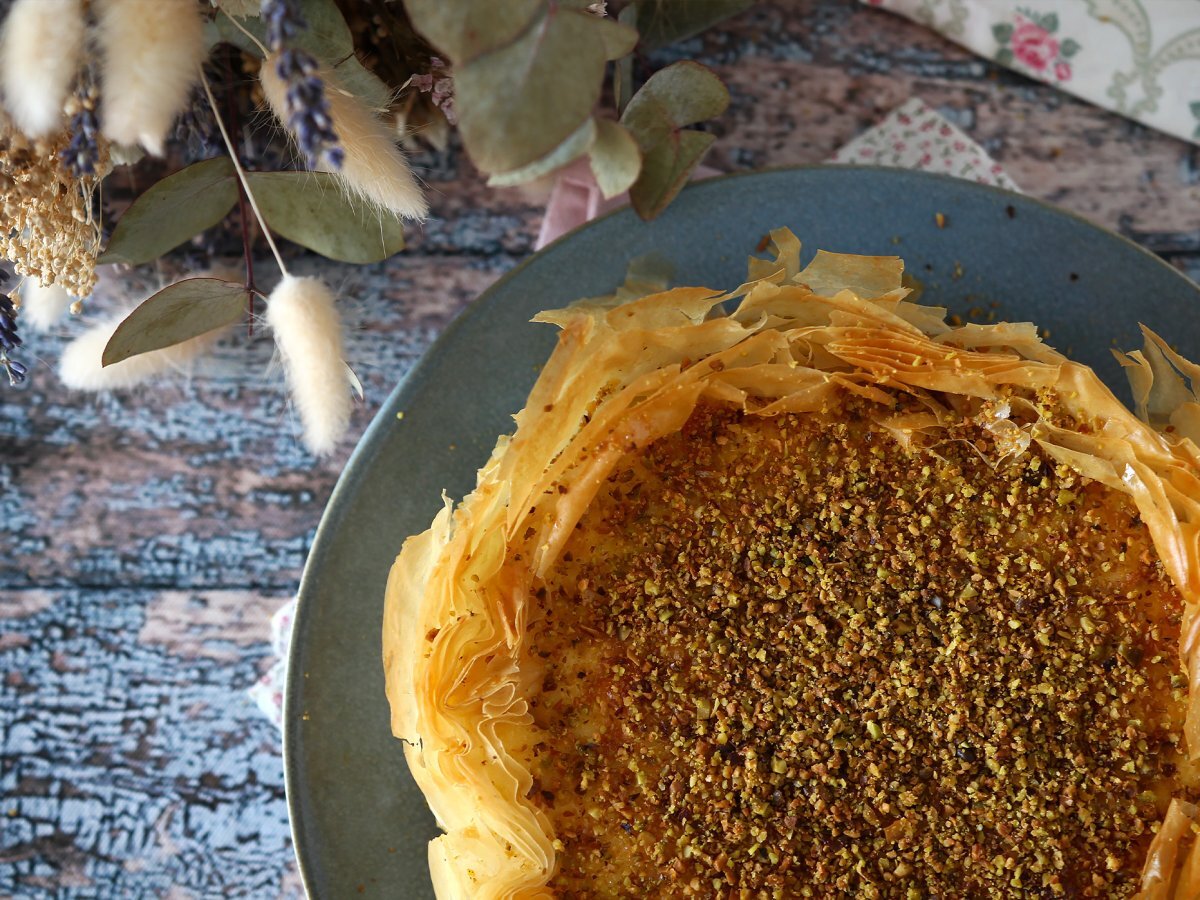 Baklavský tvarohový koláč s pistáciemi, křupavý a rozplývající se