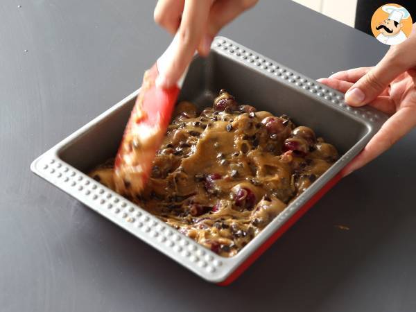 Směs nalijte do vymazané formy. Třešně rovnoměrně rozdělte.