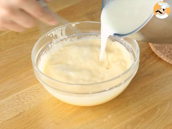Mléko přiveďte k varu. Mezitím smíchejte žloutky s cukrem, dokud směs nezbělá a nezíská krémovou konzistenci. Poté přidejte kukuřičnou mouku a dobře promíchejte.