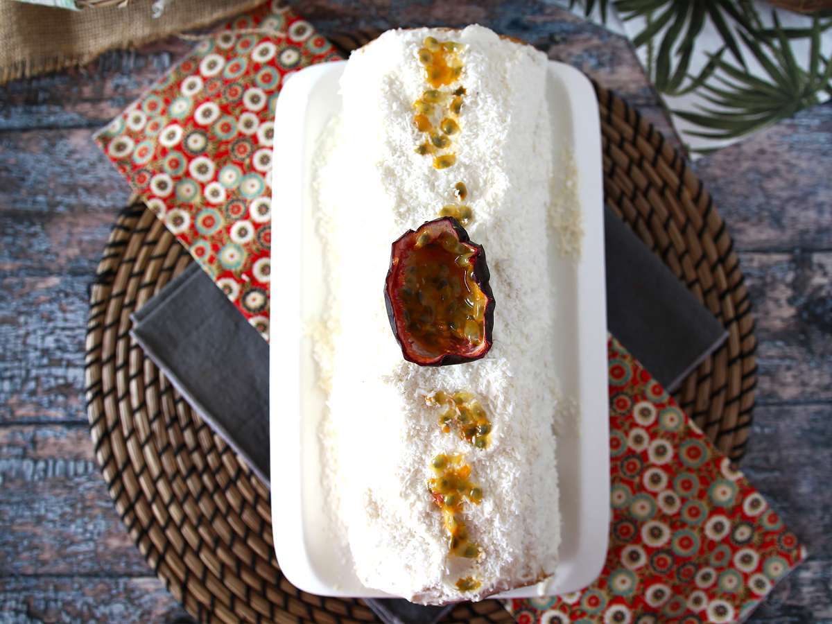 Roládu potřete krémem a posypte strouhaným kokosem. Navrch přidejte trochu marakujové dužiny a ozdobte polovinou marakuje.