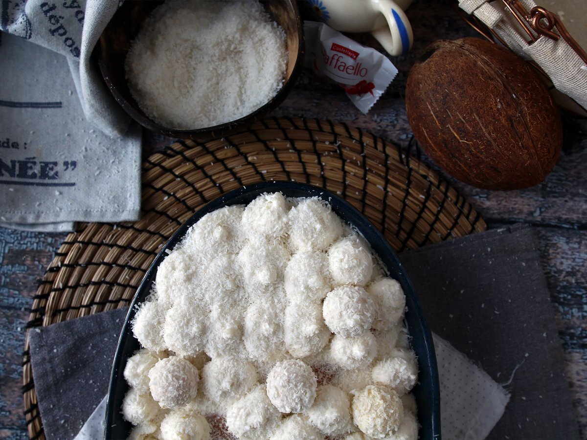 Vložte Raffaello do sekáčku. Přidejte strouhaný kokos a rozmixujte.