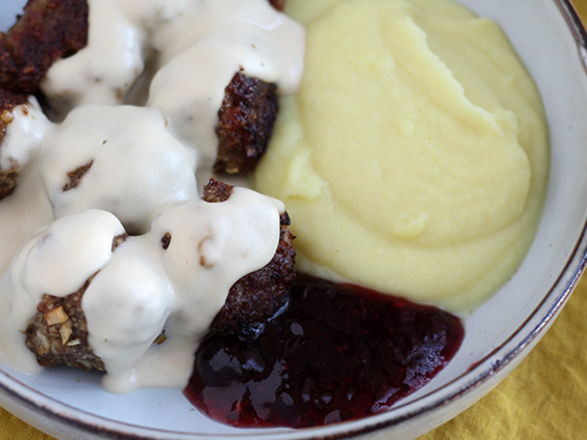 Podávejte masové kuličky s omáčkou na povrchu a na stejném talíři s bramborovou kaší a džemem z červeného ovoce.