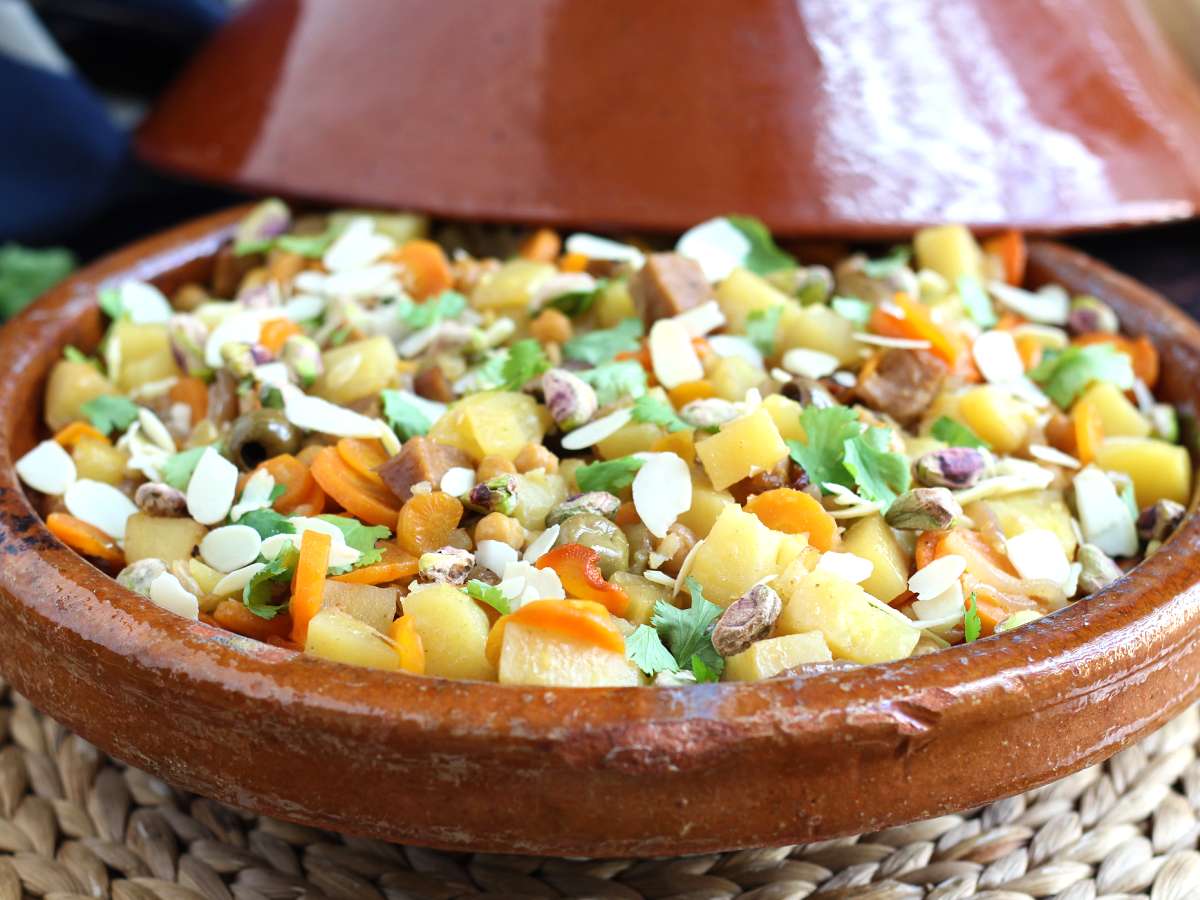 Zde je tagine plný zeleniny a rostlinných bílkovin! Je to také nový způsob přípravy seitanu, ingredience vyrobené z pšeničného nebo špaldového lepku. Zkombinujte ho s cizrnou, bramborami a mrkví a získejte zdravý a plnohodnotný pokrm. A nezapomeňte na olivy pro chuť a mandle/pistácie pro křupavost. Necháme vás sledovat recept krok za krokem a v komentářích nám napište, co si o něm myslíte ;-).