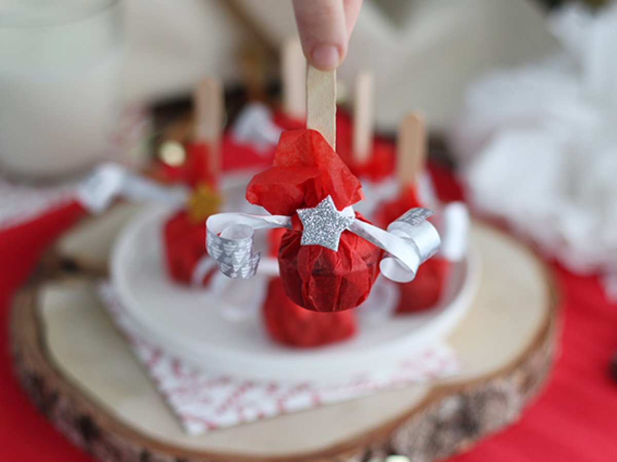 Čokoládové bonbony vyklopte a položte na čtverce krepového papíru. Papír uzavřete kolem tyčinky a zalepte boldukem. Nůžkami udělejte na bolduku smyčku a na uzel nalepte samolepku.