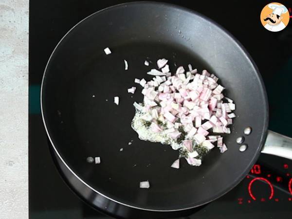 Příprava pórkového fondue: Pórek očistěte a nakrájejte nadrobno. Rozpusťte máslo a na pánvi osmahněte nakrájenou šalotku.
