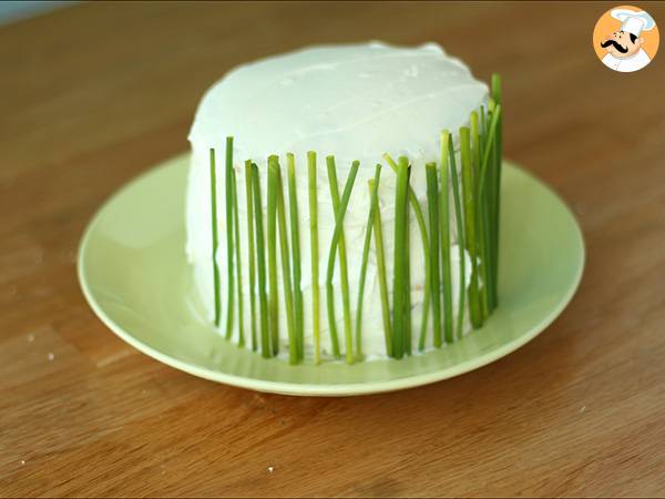 Pažitku rozkrojte na polovinu a nalepte ji na dort.