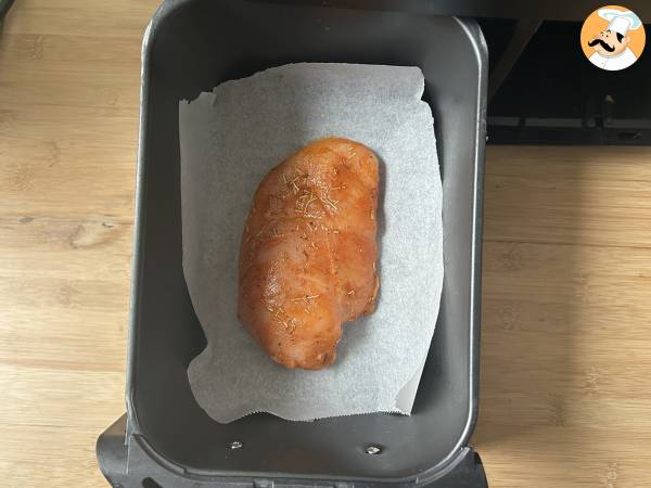 Kuřecí prsa vložte do plechu fritézy Air Fryer vyloženého papírem na pečení.