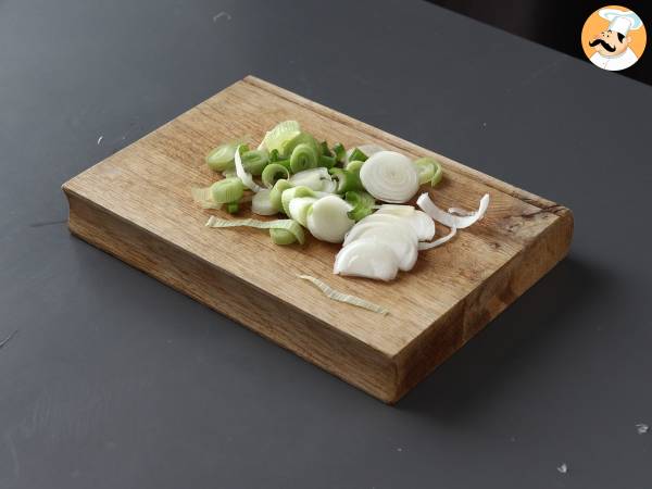 Zelenou cibuli, chilli papričku a stroužky česneku nakrájejte na malé kousky.