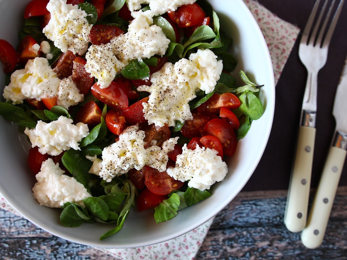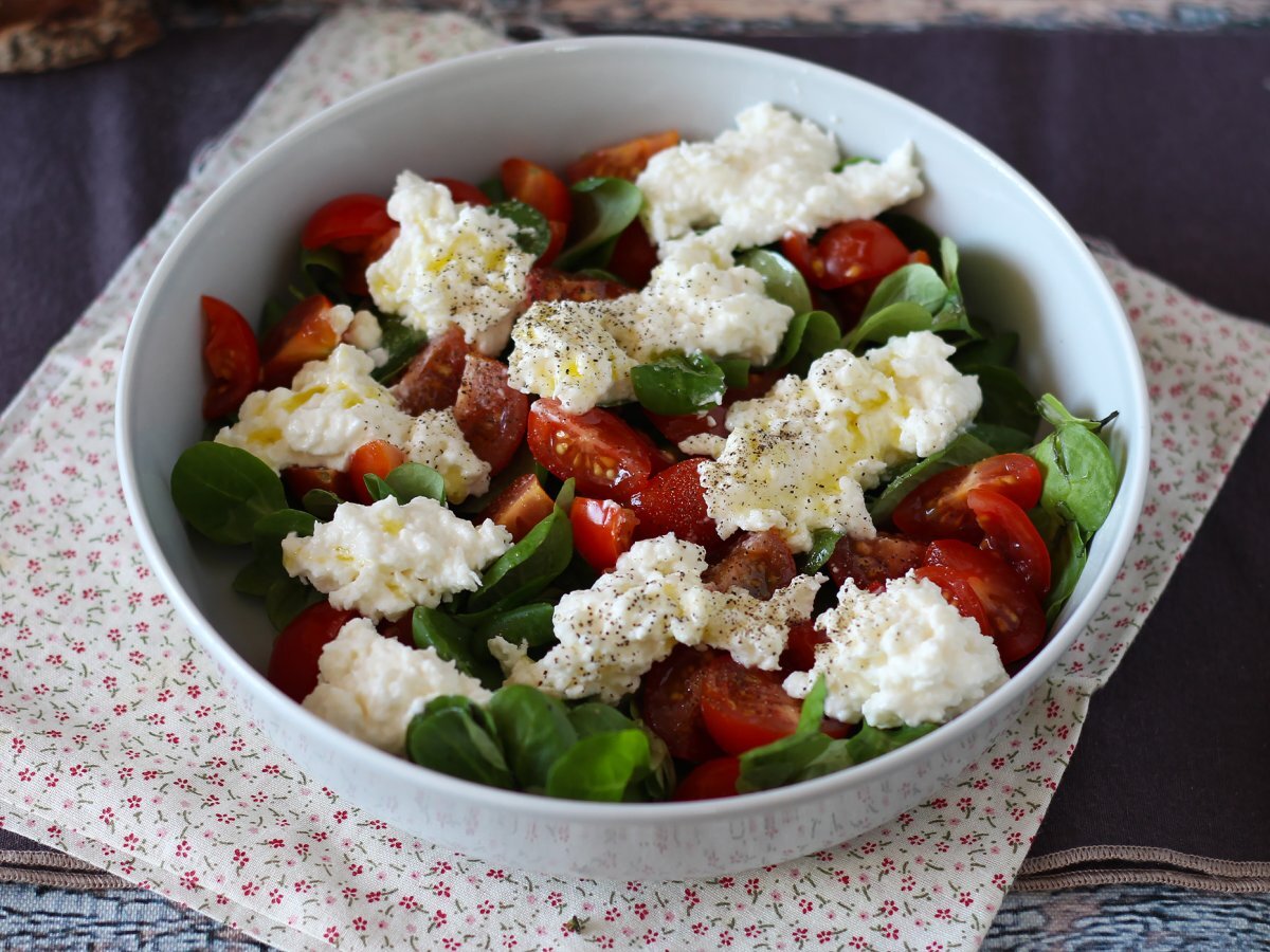 K jídlu jsme si připravili salát z polníčku a cherry rajčátek s olivovým olejem, solí a pepřem. Můžete si ho také vychutnat na toastu nebo bruschettě. Záleží jen na vás ;-).