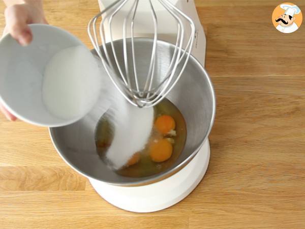 Vejce, sůl, cukr a tekutou vanilku dejte do mísy mixéru. Šlehejte při plných otáčkách po dobu 5 minut: směs by měla zdvojnásobit svůj objem.